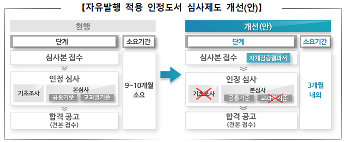 ① 첫째, ‘점진적 교과서 자유발행제([붙임1] 참조)’의 도입 근거를 마련하기 위해 인정도서의 심사 절차를 완화하였다. 이번 개정으로 인정도서를 신청할 때 집필진이 교과서의 내용 오류, 표기·표현 오류 등을 스스로 검증한 결과를 제출한 도서에 대해서는 기초조사를 제외했다. (제14조제4항 신설 및 제16조 일부개정) 즉, 자율규제 방식으로 심사를 완화하여 심사기간이 기존 9~10개월에서 3개월로 단축됨에 따라 학교에 필요한 교과용도서 공급 시기를 한층 앞당길 수 있을 예정이다.