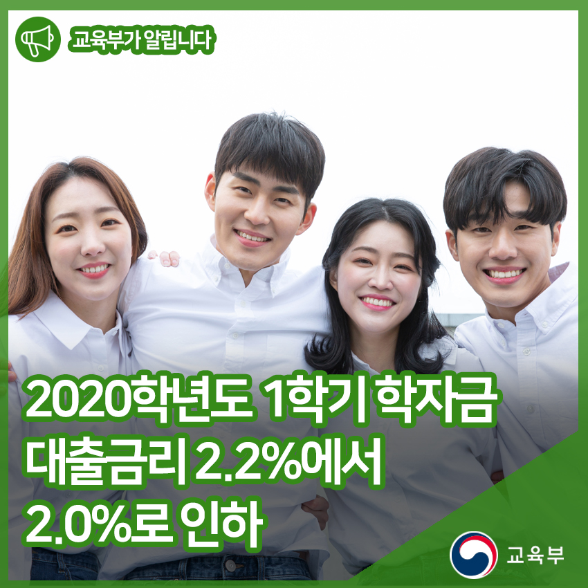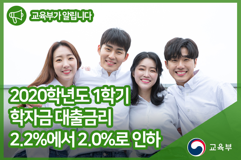 교육부(부총리 겸 교육부장관 유은혜)와 한국장학재단(이사장 이정우)은 학생·학부모의 학자금 대출 이자 부담을 경감하기 위해 2020학년도 1학기 학자금 대출금리를 지난 학기 2.2%에서 0.2%p 인하한 2.0%로 시행한다. 학자금 대출금리는 2018년에 0.05%p 인하(2.25%→2.2%)한 이후 2년 만에 0.2%p를 인하(2.2%→2.0%)한 것이며, 대출금리 인하로 올해 약 128만명의 학생들에게 연간 약 159억원의 이자부담 경감 혜택을 제공할 것으로 예상된다.