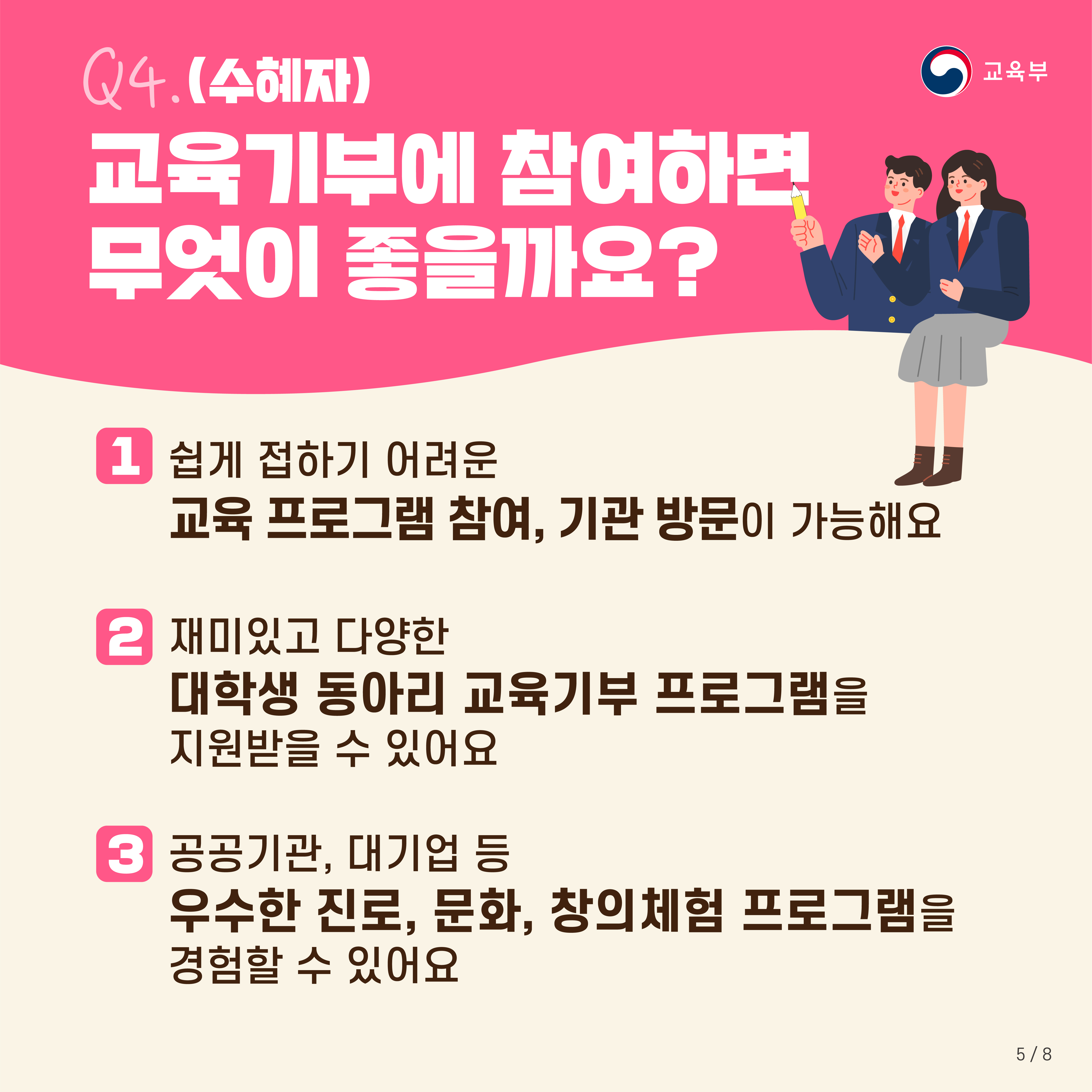 -(수혜자) 쉽게 접하기 어려운 교육 프로그램 참여와 기관 방문이 가능합니다. 재미있고 다양한 대학생 동아리 교육기부 프로그램 또한 지원받을 수 있으며, 공공기관, 대기업 등의 우수한 진로·문화·창의체험 프로그램을 경험할 수 있습니다.