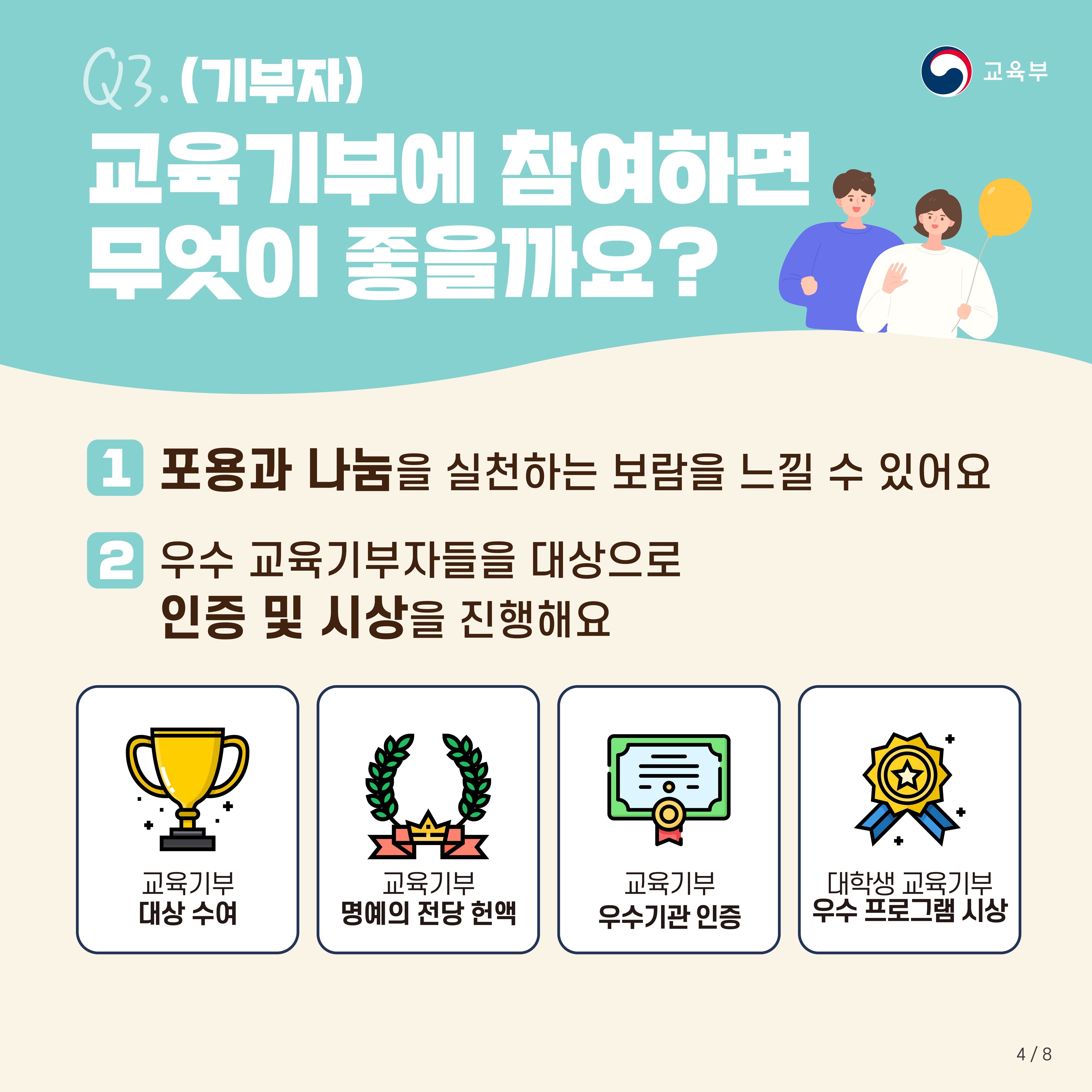 -(기부자) 포용과 나눔을 실천하는 보람을 느낄 수 있습니다. 또한 우수 교육기부자들을 대상으로 인증 및 시상을 진행합니다.