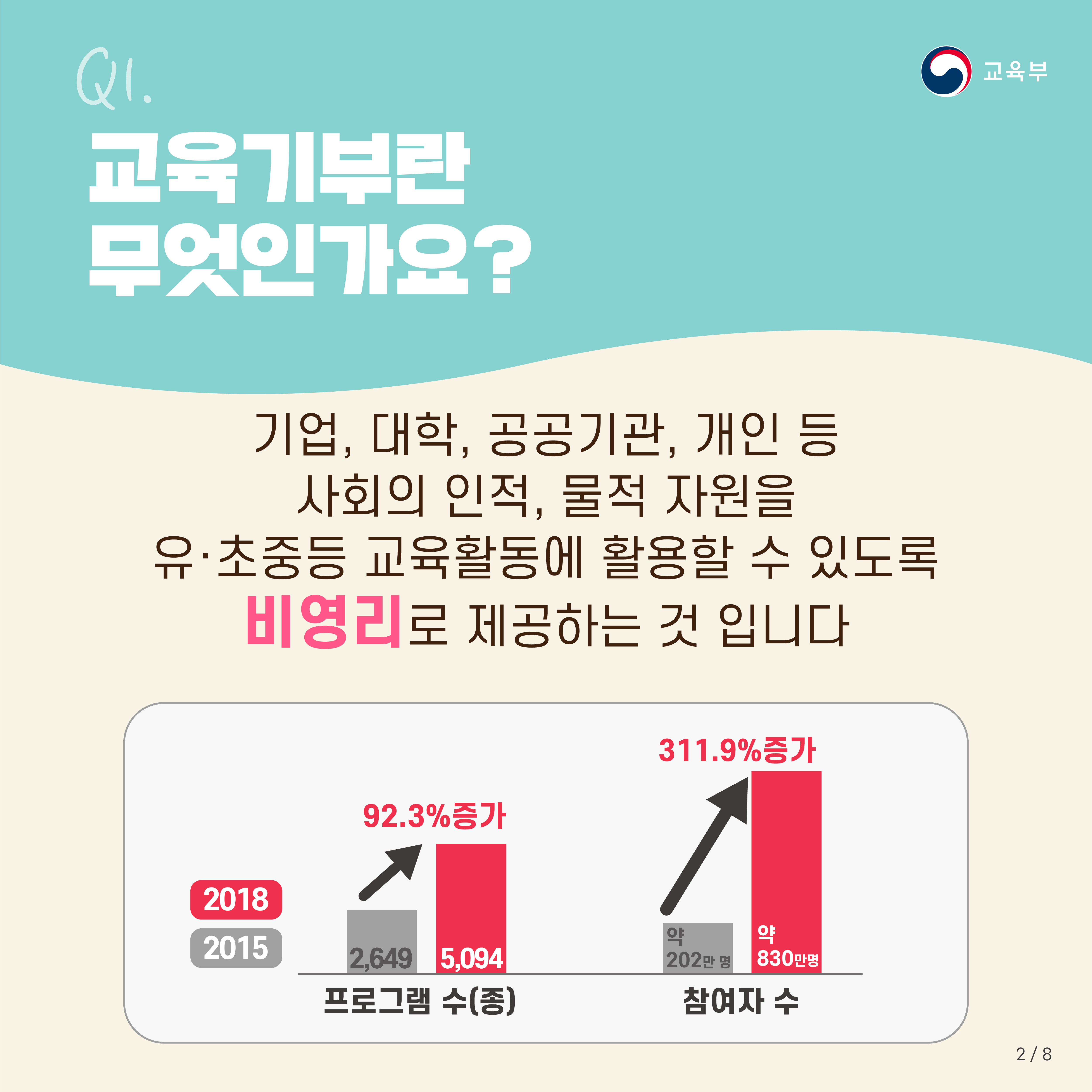 기업, 대학, 공공기관, 개인 등 사회의 인적, 물적 자원을 유·초중등 교육활동에 활용할 수 있도록 비영리로 제공하는 것입니다. 2018년 프로그램 수는 15년 대비 92.3% 증가하였으며, 참여자 수는 311.9% 증가하였습니다.