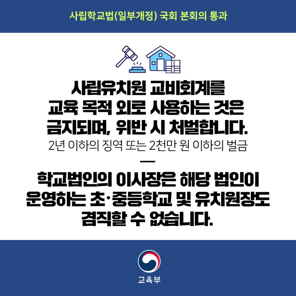 사립유치원 교비회계를 교육 목적 외로 사용하는 것은 금지되며, 위반 시 처벌합니다.