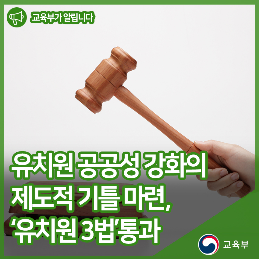 교육부(부총리 겸 교육부장관 유은혜)는 제375회 국회(임시회) 본회의에서 「유아교육법」, 「사립학교법」, 「학교급식법」 등 ‘유치원 3법’이 1월 13일(월)에 의결되었다고 발표했다.