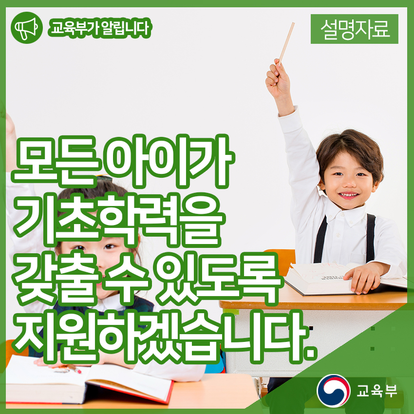 교육부는 작년 3월 모든 아이의 기초학력 보장 지원을 위해 ‘기초학력 지원 내실화 방안*’을 발표하였고, 초‧중등학생의 기초학력 진단을 통해 조기에 학습 결손을 예방하고 보정을 할 수 있도록 기초학력 보장 정책을 추진하고 있습니다.