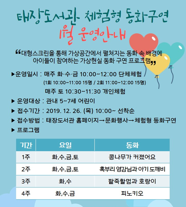 학생분들 위주로 소개해왔는데, 5~7세 어린이를 위한 프로그램인 '태장도서관의 동화 구연 프로그램'을 소개합니다.. <콩나무가 커졌어요>, <혹부리 영감님과 아기 도깨비>, <팥죽할멈과 호랑이>, <피노키오> 이렇게 총 네 가지 동화가 있습니다.
