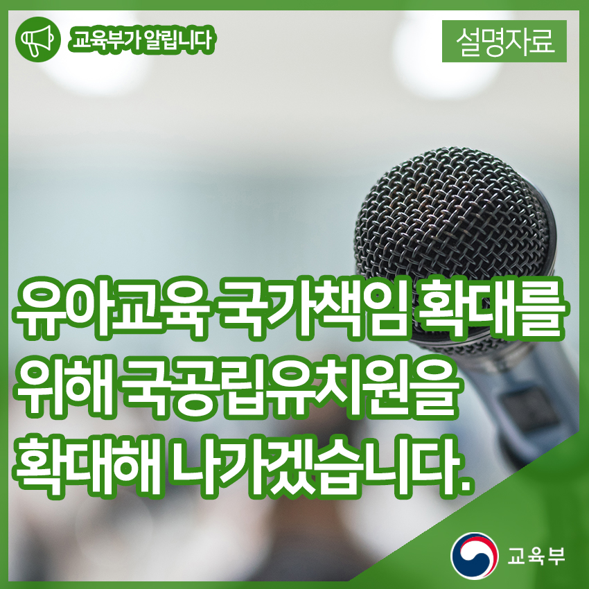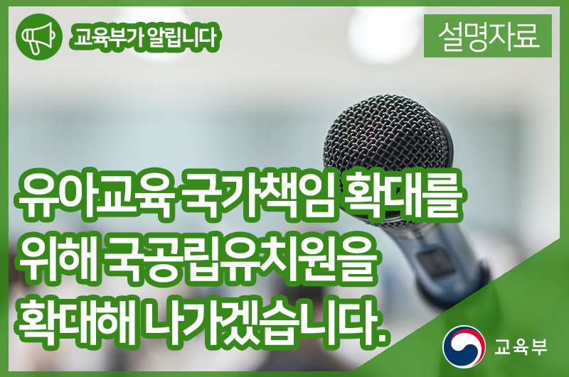교육부는 문재인 정부 핵심 국정과제인 ‘유아교육의 국가책임 확대’에 따라 국·공립유치원 확충(취원율 40%)을 추진하고 있습니다.