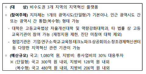 기존 대학재정지원사업들이 개별 대학의 역량을 기르는 데 중점을 두고 그 효과가 부수적으로 지역에 확산되기를 기대한 것과 달리, 이 플랫폼은 지자체가 대학·기업 등 지역혁신주체들과 함께지역의 여건과 현안을 십분 반영한 ‘지역혁신 핵심분야’를 발굴하고 대학이 주체적인 역할*을 할 수 있는 과제를 추진하는 것을 지원한다.
