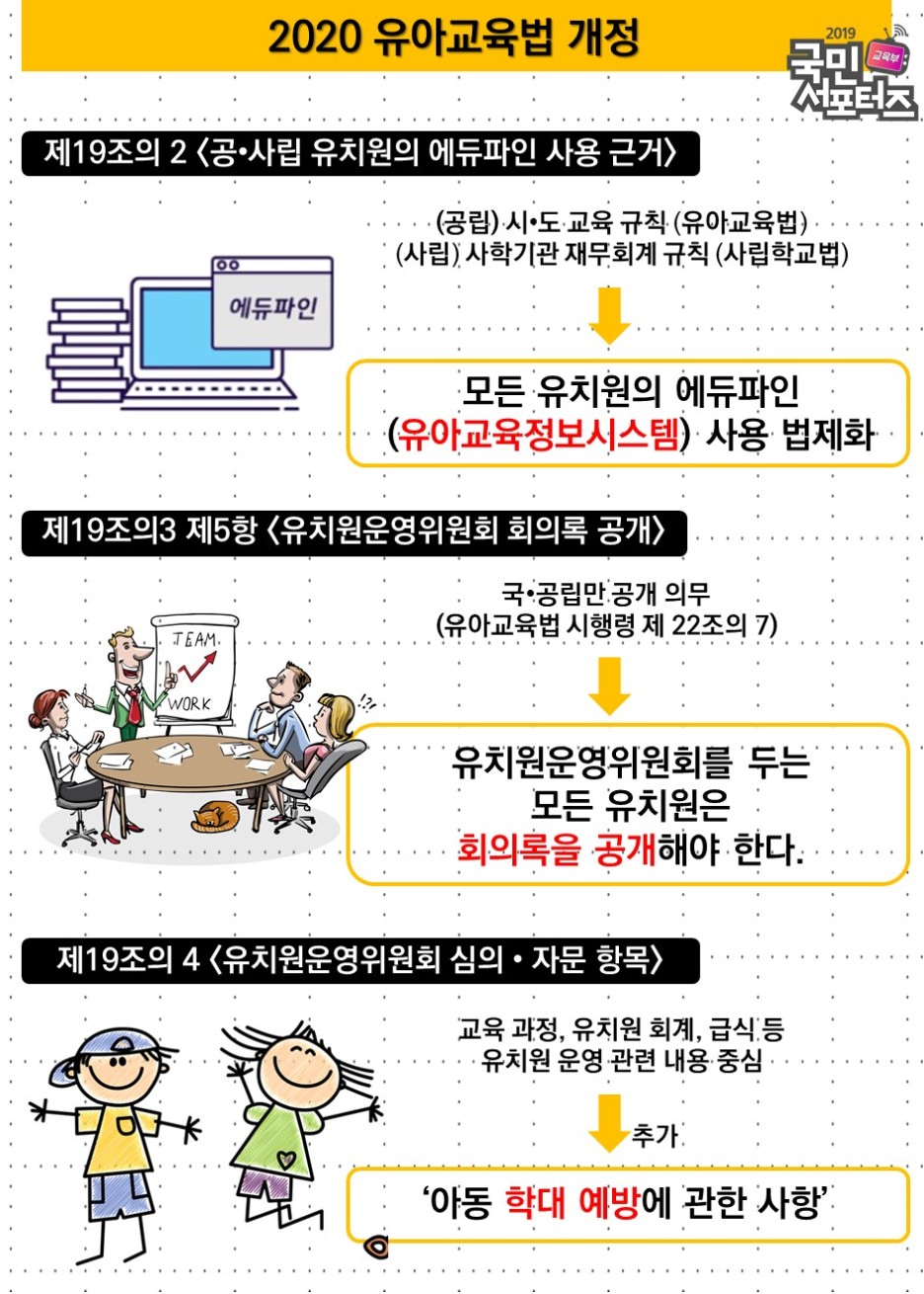 2018년 유치원 회계 투명성 확보가 사회적 관심사로 대두된 이후, 교육부는 지난 1년 동안 공공성 강화 정책을 적극적으로 추진해왔는데요. 2019년 3월, 집단 개학 연기 발표 등 반대가 있었으나 투명한 교육기관 운영을 위해 2020년 유치원 3법 개정안이 의결되었다고 합니다.