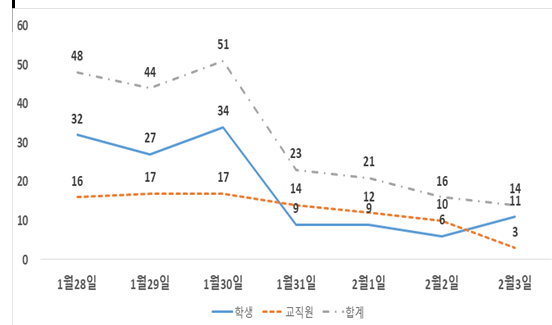 ※ 무증상 자율격리자: 중국 후베이지역 방문 후 별도 의심증상은 없으나, 입국 후 14일이 경과하지 않아 자택에 머무르는 학생‧교직원