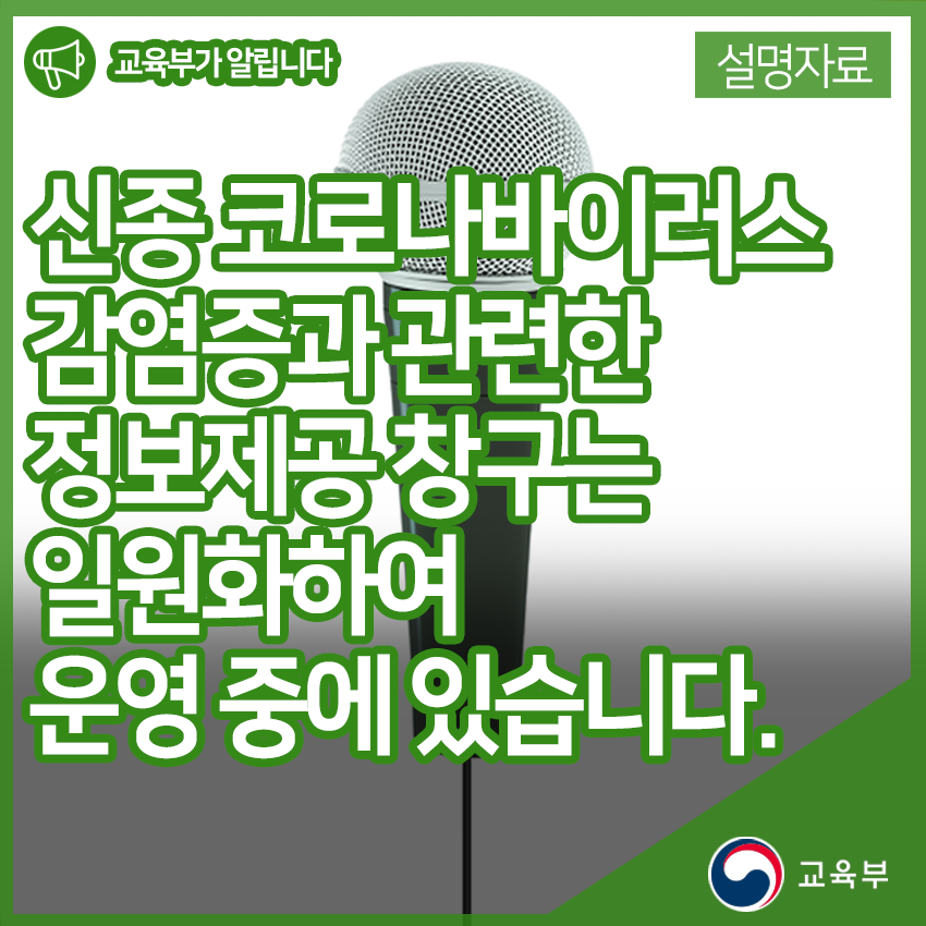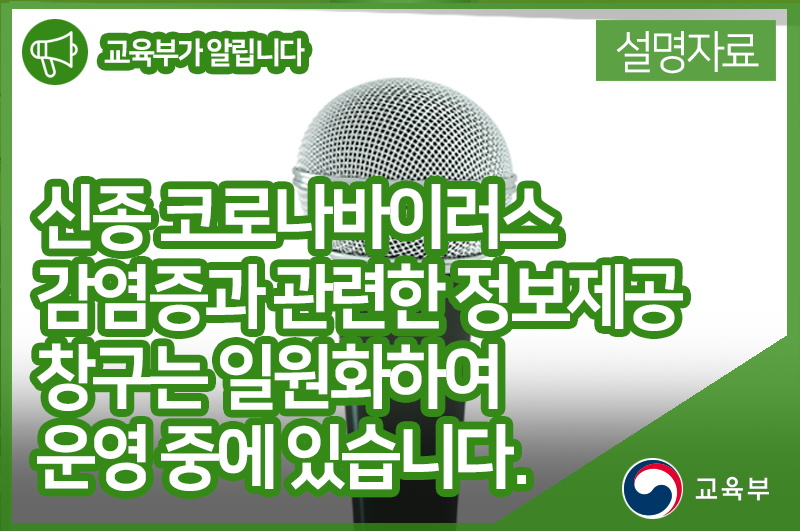 앞으로 교육부는 신종 감염병으로 인한 공중보건 위기 상황 시 질병보건정보와 같은 전문적인 정보에 대해서는 정부의 일원화된 창구를 통해 제공하되, 학교 휴업현황 등 다양한 학교운영 정보에 대해서는 교육부 홈페이지, SNS 등 다양한 경로를 통해 국민들에게 충분히 제공하도록 하겠습니다.