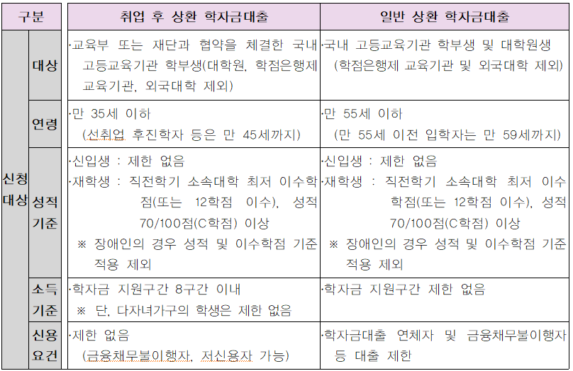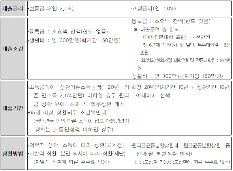 학자금 대출 제도 비교를 표로 다시 한번 살펴보도록 하겠습니다.