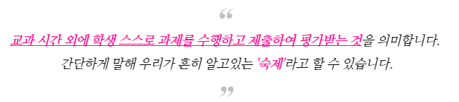 수행평가의 용어 정의에 ‘교과 수업시간에’ 라는 문구를 추가하겠다고 밝혔는데요. 이는 수업 시간 외에 이루어지는 과제형(숙제) 수행평가를 없애 학생들의 부담을 덜겠다는 의미를 담고 있습니다.
