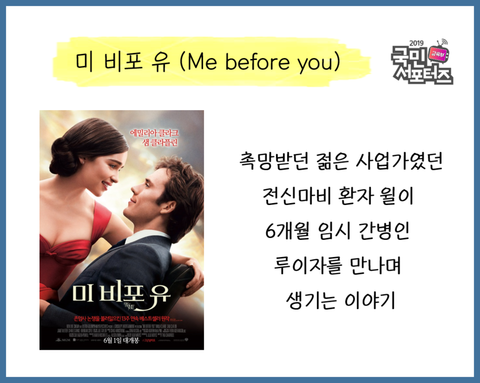 촉망받던 젊은 사업가였던 전신마비 환자 '윌'이 6개월 임시 간병인 '루이자'를 만나면서의 내용을 담고 있어요