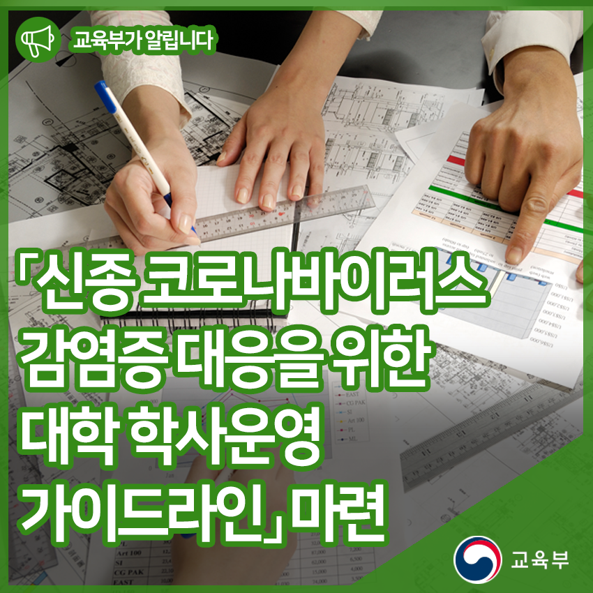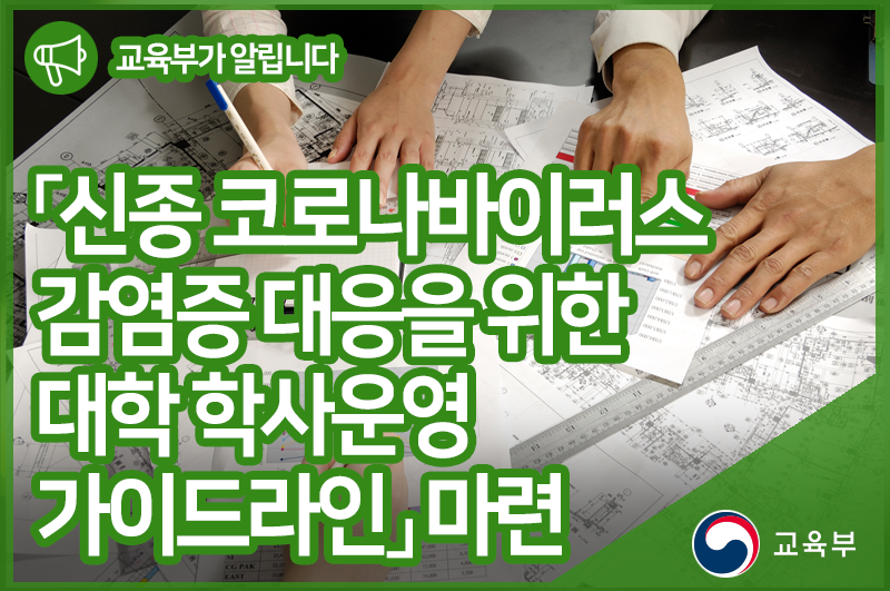 교육부(부총리 겸 교육부장관 유은혜)는 2월 5일(수) 발표한 대학 지원 대책의 후속조치로서 대학의 개강 연기에 따른 안정적 학사운영을 위해 「신종 코로나바이러스 감염증 대응을 위한학사운영 가이드라인」*을 마련하고 이를 대학에 안내하였다.