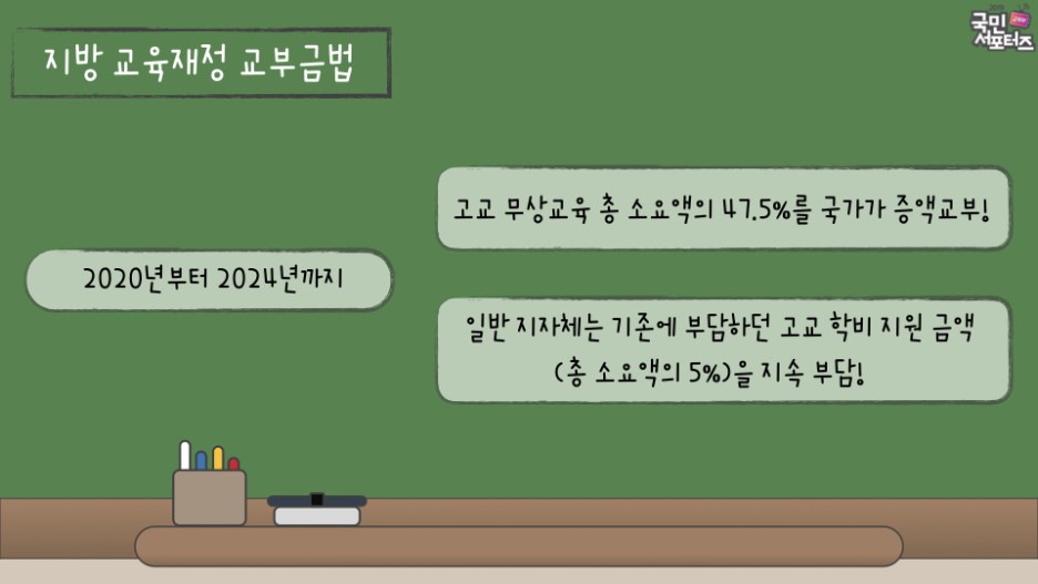 : 2020년부터 2024년까지 고교 무상교육 총 소요액의 47.5%를 국가가 증액 교부하고 일반 지자체는 기존에 부담하던 고교 학비 지원 금액(총 소요액의 5%)을 지속 부담하도록 하여 보다 안정적인 자금마련이 가능해졌답니다!