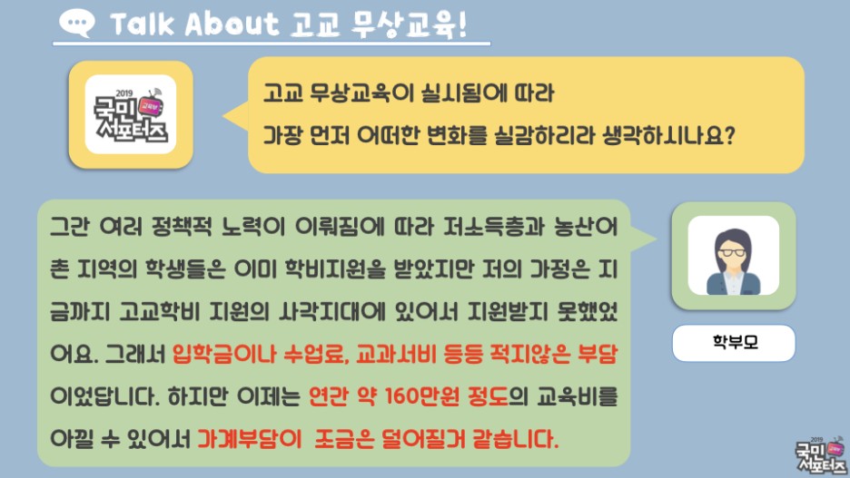 고교 무상교육에 대한 학부모님들과 학생들의 목소리를 담아보는 시간을 가졌습니다.