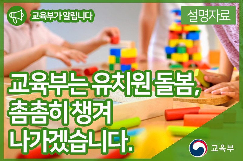 교육부는 유치원 유아를 위한 돌봄에 공백이 생기지 않도록 더욱촘촘히 챙겨 나가겠습니다.