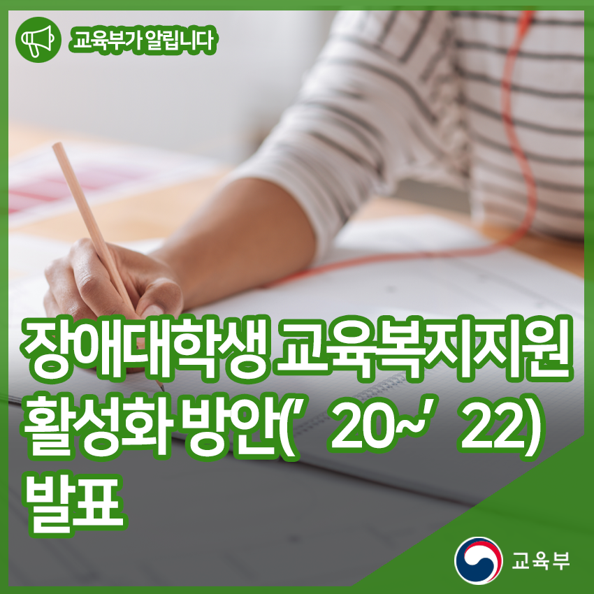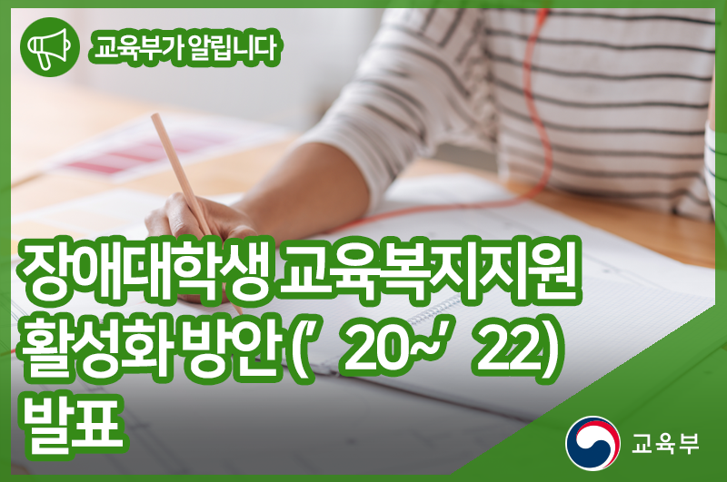 교육부(부총리 겸 교육부장관 유은혜)는 장애대학생 수*가 지속해서 증가하고 있지만 대학의 교육복지지원 수준**이 여전히 부족한 상황을 인식하고, 이들의 학습권을 보장하고 자기보호역량 등의 성장을 지원하기 위해 「장애대학생 교육복지지원 활성화 방안(’20~’22)」을 2월 19일(수)에 발표하였다.