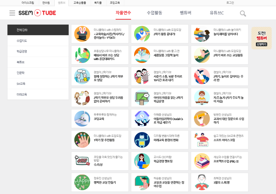 학급 운영부터 인문학, sw교육 등 관심 분야에 대한 이야기를 나누는 '자율연수'와 각 교과 활동에 대한 수업 팁 소개 동영상이 있는 '수업활동'이 있습니다! 또 창체/동아리, 안전지도, 중국어 등 관련 자료가 있는 '쌤튜버' 각 학년 교과, 차시별 관련 동영상이 있는 '유튜브C'까지! 선생님들께서 학교에서 필요한 내용을 A부터 Z까지 담고 있죠.