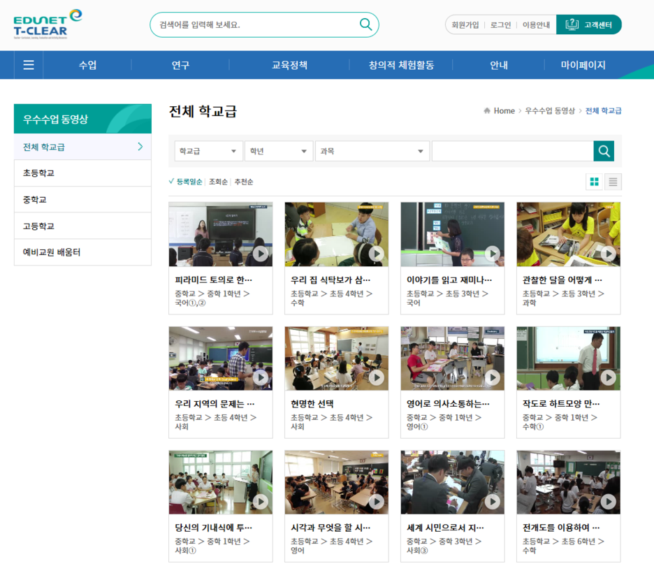 초등학교, 중학교의 수업 자료, 교원연수 등 수업 연구 방안, 교육정책 자료, 창의적 체험활동 자료를 공유하고 있습니다. (교원연수는 선생님들께서 언제든지 자신이 원하는 정보를 얻을 수 있도록 도와주는 시스템입니다.)
