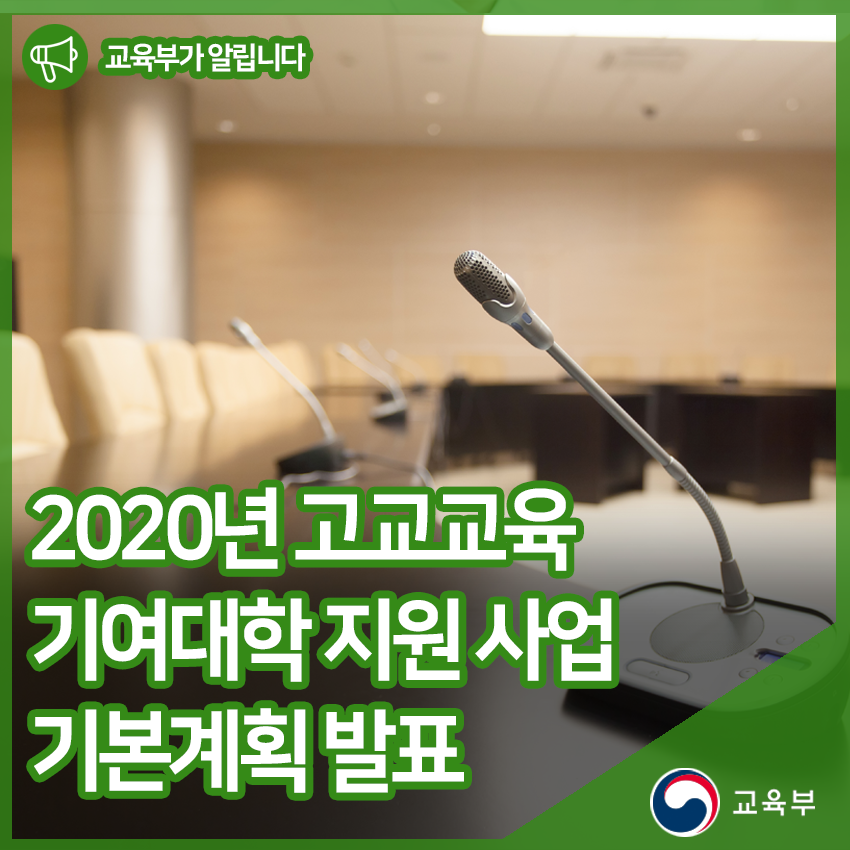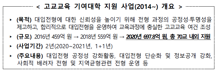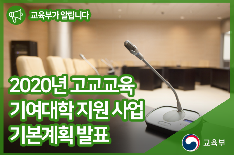교육부(부총리 겸 교육부장관 유은혜)는 대입전형의 공정성을 높이고, 학생과 학부모의 입시부담 완화에 초점을 두어 사업 내용과 대학 선정방식을 전면 개편한 「2020년 고교교육 기여대학 지원 사업 기본계획」을 2월 26일(수) 확정·발표하였다.