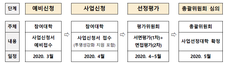 교육부는 추후 2020년 고교교육 기여대학 지원 사업의 구체적인 내용과 선정평가 일정을 대학에 안내할 예정이다.