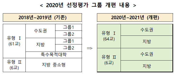 유형Ⅰ 내에서 모집인원 기준으로 평가그룹을 구분하던 기존(그룹1․2) 방식을 폐지하고 수도권과 지방 2개 그룹으로 단순화하였으며, 유형Ⅱ는 그간 사업에 선정되지 않았던 대학*을 대상으로 하여, 신규대학의 대입역량을 강화하고, 사업성과가 확산될 수 있도록 설계하였다.