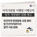 「자격기본법 시행령 및 시행규칙」 일부개정령안 입법 예고 - 민간자격 변경등록 규정 정비 및 민간자격관리자 결격 사유 완화 - ) --> 교육부는 3월 9일 민간자격 변경등록 규정 정비 및 민간자격 관리자에 대한 결격사유 완화를 위한 「자격기본법 시행령 및 시행규칙」일부개정령안 입법을 예고했습니다. 「자격기본법」개정(’16.12.20, 시행일 ’17.6.21.)으로 민간자격의 변경등록 근거가 시행령에서 법률로 상향됨에 따라 같은 법의 시행령 규정을 정비하고, 시행규칙에 변경등록의 적용범위를 구체화하겠다는 것입니다. 또한, 「자격기본법」에 민간자격관리자가 될 수 없는 결격사유 중 민간자격 관리․운영에 관한 행위능력이 있음을 입증한 ‘피한정후견인’은 제외하도록 완화, 동법 시행규칙에 ‘행위능력이 있음’을 증..