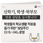 신학기, 학생·학부모 맞춤 상담을 실시합니다! 학생들의 학교생활 적응을 돕기 위한「상담주간(3.13.~24)」운영 학교폭력, 아동학대, 자살 등 위기요인을 조기 감지하여 학생을 보호하고, 자녀교육 방법 상담 신학기를 맞아 학생들의 학교생활 적응을 돕기 위하여, 교육부가 3월 13일(월)부터 3월 24일(금)까지 학생․학부모를 대상으로 맞춤형 집중 ‘상담 주간’을 운영합니다! 이에 앞서 3월 6일(월) ~ 3월 10일(금)은 홍보주간으로 지정하여 시·도교육청과 학교에서는 자체적으로 홈페이지 배너 설치, 가정통신문 발송 등을 통해 학생·학부모에게 상담 주간 운영을 홍보하고, 참여를 유도할 계획이에요. 본격적인 ‘상담주간’은 3월 13일(월) ~ 3월 24일(금)까지 약 2주간 진행되는데요, 학생·학부모를 대..