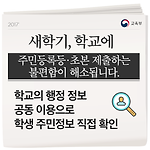 학교에 주민등록등․초본 제출하는 불편함이 해소됩니다! 행정정보 공동이용으로 학교가 학생 주민정보 직접 확인해요 올해 신학기부터는 학생, 학부모가 직접 학교에 주민등록등․초본과 외국인등록증명서를 발급받아 제출하지 않아도 됩니다! 일선 학교에서도 학생들의 주민등록등․초본, 외국인등록사실증명 등의 정보를 행정정보 공동이용망을 통해 직접 확인할 수 있게되었기 때문인데요, 행정정보 공동이용이란? : 행정기관 등의 장은 직무상 작성하거나 취득하여 관리, 수집․보유하고 있는 행정정보를 필요로 하는 다른 행정기관 등과 공동으로 이용(근거: 전자정부법 제2조 및 제36조 등) 그동안은 학교생활기록부의 인적사항 확인 및 정정, 전입학 등 학생들의 주민등록번호와 주소 등을 확인하기 위해 학생들이 학교에 주민등록등․초..