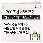 2017년 SW교육 연구·선도학교 1200개 선정 - SW교육 필수화를 대비해, 시범운영 확대하여 학교 우수 모델 확산 - 교육부와 미래창조과학부가 2017년도 소프트웨어(SW)교육 연구·선도학교 1,200개 학교를 발표했습니다. 2018년부터 단계별로 시작되는 SW교육 필수화*에 대비하여, 올해 1,200개교로 확대된 SW교육 연구·선도학교는 정규 교육과정 등을 통해 SW교육을 운영하고 우수사례를 발굴, 널리 알리는 역할을 합니다. * 2015 개정 교육과정(’15.9월 고시)에 따라 초등학교는 ’19년부터 5~6학년 ‘실과’과목에서 17시간 이상, 중학교는 ’18년부터 단계적으로 ‘정보’과목에서 34시간 이상 SW교육 필수 실시합니다. ※ SW교육 연구·선도학교 수 : (’15) 228개교 → (..