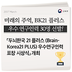 미래의 주역, BK21 플러스 우수 연구인력 30명 선발! 교육부와 한국연구재단은 3월 8일, 서울 아모리스에서「두뇌한국 21 플러스(BrainKorea21 PLUS, 이하 BK21 플러스) 우수연구인력 표창 시상식」을 개최했습니다. 이번 행사는 BK21 플러스 사업에 참여하는 대학원생과 신진연구인력 중, 탁월한 연구 성과로 높은 발전가능성을 가진 인재들을 발굴하고 격려하는 자리였는데요. 총 30명의 수상자는 순수 국내파 학생임에도 네이처(NATURE) 등 세계적인 잡지에 제1저자로 논문을 발표하고, 국제 저명 학자와의 교류 및 공동 연구를 활발히 수행하면서, 각자의 연구영역을 확장하고 있답니다. BK21 플러스는 ‘학문후속세대’가 안정적으로 학업과 연구에 전념할 수 있도록, 대학원 학과로 구성된 사업단..