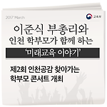 이준식 부총리와 인천 학부모가 함께하는 `미래교육 이야기` - 제2회 인천공감 찾아가는 학부모 콘서트 개최 - 이준식 교육부 부총리가 3월 8일 인천학생교육문화회관에서 열린 제2회 ‘2017 찾아가는 학부모 콘서트’에 참석합니다. 이번 콘서트는 교육부와 인천시교육청, 한국직업능력개발원이 공동으로 개최한 행사인데요. 미래교육 비전과 교육현장의 변화하는 모습을 공유하여 자녀교육에 대한 학부모의 불안감을 해소하기 위해 마련되었죠. 1부 행사에서는 빅데이터 전문가 송길영 다음소프트 부사장이 “적응, 그리고 협력”이란 주제의 특강으로 많은 학부모들로부터 뜨거운 호응을 받았습니다. 이어진 2부 콘서트에서는 이준식 부총리 외에 송길영 다음소프트 부사장, 권오현 전 서울대 입학본부장 등이 패널로 참석하여 ‘오늘, ..