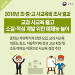 2016년 초·중·고 사교육비 조사 결과 교과 사교육 줄고, 소질·적성 계발 위한 예체능 늘어 - 중학교 자유학기제 전면 도입, 교과 사교육 의존도 감소 - 자유학기제 성과 고교 확산 및 초등 예체능 지원으로 사교육 경감 추진 ) --> 교육부는 3월 14일, 통계청과 공동 실시한 2016년 초·중·고 사교육비 조사 결과를 발표했습니다. 이번 조사 결과는 ’16년 전국 초·중·고 1,483개교 학부모 43,000여명을 대상으로 연 2회(5~6월, 9~10월) 사교육비 및 관련 교육비를 조사한 내용을 분석한 것입니다. ① 주요 결과 2016년 사교육비 총 규모는 약 18조1천억원으로 2015년 17조8천억원 대비 2천3백억원(↑1.3%) 증가하였고, 학교급별 사교육비 총 규모는 초등학교 7.7조원(↑2..