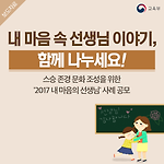 내 마음 속 선생님의 이야기, 함께 나누세요! - 스승 존경 문화 조성을 위한‘2017 내 마음의 선생님’사례 공모 - ) --> 교육부는 3월 20일(월)부터 ‘2017 「내 마음의 선생님」’사례 공모를 실시합니다. 이번 공모는 국민 누구나 참여할 수 있으며, ‘수기와 편지’ ‘사진’, ‘만화’, ‘동영상’, ‘선플 달기’*등으로 분야를 다양화 하고, 시상 규모 및 참여 이벤트를 확대하여, 국민 누구나 손쉽게 공모홈페이지에 접속할 수 있도록 접근성을 높였습니다. * 선플 달기(선생님께 응원 한 마디) 분야는 기프티콘 증정(3만원 상당) 이벤트 ※ 인터넷 포털(네이버, 다음) 배너 클릭, 검색창에 ‘내마음의선생님’ 검색어 입력, 페이스북, 유튜브를 통해서도 공모홈페이지 접속 가능 ) --> 공모 접수는 ..