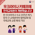 우크라이나 키예프에 한국교육원이 개원했습니다! 한-우크라이나 수교 25주년 계기, 양국 간 교육분야의 협력강화 및 국제교육 교류 확대 기대 ) --> 교육부는 우크라이나의 수도인 키예프에 3월 17일, 한국교육원(이하 교육원)을 개원하며, 한국어 교육 활성화를 위한 MOU를 체결한다고 밝혔습니다. 그동안 고려인(3만여 명)과 교민사회가 지속해서 교육원 설립을 요청해 왔었으며, 이에 교육부는 재외동포들의 유대감 및 한민족 정체성 교육 강화를 위해 교육원을 개원 하게 되었는데요. 우크라이나는 동유럽 중심에 위치하는 국가로 유럽과 아시아의 가교역할을 하고 있어, 우크라이나 한국교육원은 세계 속에 대한민국 교육의 위상을 적극적으로 홍보하는 역할을 수행할 것으로 기대됩니다. ) --> 교육원 설치를 계기로 우크라..