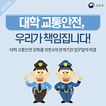 대학 교통안전, 우리가 책임집니다! - 대학 교통안전 강화를 위한 6개 관계기관 업무협약 체결 - ) --> 교육부는 국민안전처 외 4개 기관*과 ‘대학 교통안전 강화’를 위한 업무협약을 2017. 04. 12(수) 15시 정부서울청사에서 체결했어요. * 한국대학교육협의회(회장 장호성), 한국전문대학교육협의회(회장 이기우), 도로교통공단(이사장 신용선), 손해보험협회(회장 장남식) ) --> 이번 업무협약은 관계기관 간 상호 긴밀하고 우호적인 협력을 통해 빈발하는 대학 내․외의 교통사고를 예방하고 안전한 교육환경을 조성하고자 추진되었는데요, 그간 대학은 교육․연구경쟁력에 치중하여 학생안전의 문제에는 상대적으로 관심이 낮아 관리의 사각지대에 있었으며, 특히, 도로교통법의 적용을 받지 않는 대학 내 도로에..