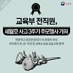 교육부 전직원, 세월호 사고 3주기 추모행사 가져 - 차분하고 경건한 분위기 속 희생자 추모 - 추모행사 후, 장·차관 등 심폐소생술 실습교육 참여 ) --> 교육부는 4월 11일(화) 15시에 정부세종청사 15동 대강당에서 전직원이 참여한 가운데 세월호 사고 3주기 추모행사를 실시했습니다. 이번 추모행사는 세월호 사고 3주기를 맞이하여 희생된 모든 분들의 명복을 빌고, 소중한 가족을 잃은 유가족 분들을 위로하기 위해 마련되었는데요 . 또한, 세월호 인양이 진행되고 있는 상황에서 희생자 중 미수습된 9명(학생 4명, 교사 2명, 일반인 3명)이 가족의 품으로 조속히 돌아오길 바라는 교육가족의 간절한 마음을 모았습니다. 추모행사는 추모 묵념, 부총리 추모사 낭독 및 안전을 주제로 한 강의 순으로 진행되..