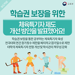 학습권 보장을 위한 체육특기자 제도 개선 방안을 발표했어요! 학습권 보장을 통한 공부하는 체육특기자 육성 전국대회 연간 참가횟수 제한을 폐지하고 참가일수로 제한 대학의 체육특기자 전형 개선 및 학사관리 책무성 강화 교육부는 체육특기자의 전인적 성장을 도모하고 학습 및 진로‧진학지원을 통해 ‘공부하는 체육특기자’ 육성으로 학교체육의 본질을 회복하고자 「체육특기자 제도개선 방안」을 발표했습니다. 이번 개선 방안은 체육특기자가 초중등 학교부터 대학까지 운동과 학업을 병행할 수 있도록 종합적으로 지원하는 한편, 체육특기자 부정 입학을 근절하고자 마련되었는데요. 이를 통해 기초 학습역량이 부족하여 사회 부적응자로 전락하는 문제점 등을 예방하고 다양한 진로기회를 가질 수 있도록 할 예정입니다. 그럼 「체육특기자..
