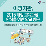 이영 차관, 2015 개정 교육과정 안착을 위한 학교 방문 - ‘초등학교 교육과정 안착 지원’을 위한 의견 수렴 - 이영 차관은 4월 4일(화) ‘전남 벌교초등학교’ 를 방문하여 2017년부터 적용된 2015 개정 교육과정 운영 현황을 파악하고, 초등학교 ‘한글교육 및 안전한 생활’ 수업을 비롯한 교육과정 안착 지원에 대한 의견을 수렴했습니다. 이영 차관은 간담회에서 올 3월부터 적용된 2015 개정 교육과정을 중심으로 창의적인 학교 교육과정을 구성‧운영하고 있는 교원들의 노고를 격려하고, 학부모 및 학교관계자, 시도교육청과 소통하며 교육과정 안착을 위한 현장의 목소리를 들었고, 1~2학년 학생을 대상으로 진행되는 ‘한글 교육’과 ‘안전한 생활’수업에 참여하여 2015 개정 교육과정 운영을 직접 ..