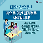 대학 창업팀! 창업을 향한 대장정을 시작합니다! - 4월 5일부터 수도권을 시작으로 「창업유망팀 300」설명회 개최 - 교육부는 대학생들의 잠재력 있는 창업 아이디어를 발굴하고 육성하기 위하여 17년 ‘창업유망팀 300’ 경진대회를 개최하고, 사전 설명회를 6개 권역별로 2016. 4. 5.(수)부터 순회를 시작합니다. ‘창업유망팀 300’ 경진대회는 교육부가 주최하고, 한국연구재단, (재)한국청년기업가정신재단이 공동 주관하는 형태로 진행되는데요. 이번 설명회는 4월 5일(수) 수도권(서울)을 시작으로 4월 21일(금) 호남제주권(전남대)까지 총 여섯 차례 이어지며, 창업을 희망하는 대학(원)생과 대학 창업교육 관계자를 대상으로 ‘창업유망팀 300’ 선발·육성계획, 추진절차, 지원혜택 및 후속지원 방안 ..