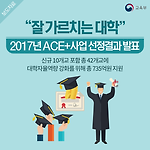 “잘 가르치는 대학”2017년 ACE+사업 선정결과 발표- 신규 10개교 포함 총 42개교에 대학자율역량 강화를 위해 총 735억원 지원 - 교육부와 한국대학교육협의회(대학교육협의회장 장호성)는 「2017년 대학자율역량강화지원사업(이하, ACE+사업)」의 신규선정대학 10개교를 포함한 지원대학 42개교의 명단을 발표했습니다. 2017년 ACE+사업은 2010년에 출범한 「학부교육선도대학육성(ACE)사업」을 확대․개편한 사업으로 ‘잘 가르치는 대학’ 육성을 목표로 매년 신규 지원 대학을 선정하여 4년(2+2년) 동안 지원하고 있으며, 2017년에는 ’14~’16년에 선정된 32개 대학과 올해 새로 선정된 10개 대학에 약 20억 원 내외(교원양성대학은 5억 원 내외)를 지원할 예정입니다. 2017년 ACE..
