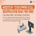융합전공 ․ 전공선택제 도입,창의혁신인재 양성 기반 마련 -「고등교육법 시행령」일부개정령안 국무회의 통과 - ∙ 다학기제․집중수업 허용, 학과별․학년별 다른 학기 운영 가능 ∙ 석사 수업연한 단축기간 1년까지 확대, 석사 논문제출 자율화 ∙ 전문대학 학위심화과정 졸업학점 자율화 교육부는 4차 산업혁명에 대응하여 대학이 학사제도를 유연하게 운영할 수 있도록 지난 12월 9일 마련한 ‘대학 학사제도 개선방안’의 후속조치로, 융합전공제 도입, 다학기제․집중수업․전공선택제 허용 등을 주요 내용으로 하는「고등교육법 시행령」 일부개정령안이 5월 2일(화) 국무회의에서 통과되었다고 밝혔습니다. 이번 시행령 개정을 통해 변경되는 주요 제도를 한번 알아볼까요? 1. 다학기제 및 유연학기제 도입 2. 융합전공 등 전공 ..