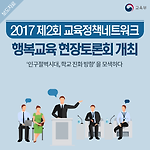 교육부, 2017 제2회 교육정책네트워크 행복교육 현장토론회 개최 - 인구절벽시대, 학교 진화 방향을 모색하다 - 교육부와 17개 시‧도교육청, 한국교육개발원 등 7개 교육 관계기관이 참여하는 ‘교육정책네트워크’는 오는 5월 30일(화) 오후 2시부터 한국교육개발원 대강당에서 ‘인구절벽시대의 학교 진화 방향 모색’을 주제로 ‘2017년 제2회 교육정책네트워크 행복교육 현장토론회’를 개최합니다. 지난 4월 13일 “즐거운 배움을 위한 수업·평가 혁신 어떻게 할 것인가?”를 주제로 강원진로교육원에서 개최한 제1회 현장토론회에 이어 올해 두 번째로 개최되는 것인데요. 이번 토론회는 교육부, 충북교육청, 교육정책네트워크가 공동으로 주최하고, 한국교육개발원, 대전교육청, 세종교육청, 충남교육청이 공동 주관하였..