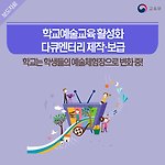'학교는 학생들의 예술체험장으로 변화 중' 학교예술교육 활성화 다큐멘터리 제작․보급 교육부가 학생들의 예술향유 능력과 창의성, 바른 인성을 함양할 수 있도록 예술체험장으로 변화하고 있는 학교의 예술교육 활동 모습을 담아 다큐멘터리로 제작하여 보급합니다! 다큐멘터리는 학교예술교육 지원 사업의 우수사례를 효과적으로 확산하고, 정책의 성과도 알림으로써 학교와 사회 전반에 예술교육 사업의 참여를 높이고자 제작하였는데요. 예술드림학교(구로중), 예술거점학교(안양여고) 등 총 5편의 학교예술교육 우수사례로 구성하였습니다. '학교예술교육지원사업'으로는 예술교육거점학교, 예술드림학교, 예술중점학교, 지역연계학교예술교육활성화 사업, 학생 오케스트라/뮤지컬/연극 등 예술동아리 지원, 악기지원사업 등이 있습니다. 그렇다면 ..