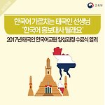 한국어 가르치는 태국인 선생님 ‘한국어 홍보대사 될래요’ - 2017년 태국인 한국어교원 양성과정 수료식 열려 - 교육부는 6월 8일(목) 10시 한국외국어대학교에서 태국인 한국어 교원의 4개월간의 연수 과정 수료를 축하하고 이들을 격려하기 위한 수료식을 가졌습니다. 이날 행사에는 교육부 국제협력관, 한국외대 총장 등이 참석하여 태국인 한국어 교원에게 수료증을 전달하고 한국어 교원으로서 자긍심을 가지도록 격려했는데요. 교원들은 본국으로 돌아가 현지 학생들에게 한국을 알리고, 한국어가 제대로 전파될 수 있도록 최선을 다해 가르치겠다는 포부를 밝혔습니다. 수료식을 마친 교원들은 6월 11일 태국으로 출국하며, 현지에서 남은 1년의 교육을 마치면 한국어교사자격증을 취득합니다. “친구들에게 한국어를 가르쳐주고 ..