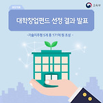 대학창업펀드 선정 결과 발표 - 기술지주형 5개 총 171억 원 조성 - 교육부와 한국벤처투자(주)는 대학창업펀드 선정 결과를 발표했습니다. 대학창업펀드란 무엇일까요? 대학창업펀드란 대학과 정부 매칭으로 대학의 창업 기업에 집중 투자하는 펀드로서, 대학창업교육이 실전창업으로 이어질 수 있도록 투자금을 지원하는 사업으로 올해 최초로 추진되어 대학 현장의 많은 관심을 받고 있습니다. 이번 대학창업펀드 선정에는 (대학)기술지주형 11개, (개인)전문투자형 1개, 총 12개 조합이 지원하여, 1차 심의(서류 심사 및 현장 실사)와 2차 심의(대면평가)를 통해 대학의 창업지원 의지와 펀드 운용능력 등 다양한 요소를 평가했습니다. 심사 결과, 고려대기술지주, 부산연합기술지주, 서울대기술지주, 연세대기술지주, 전남대..