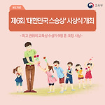 제6회 '대한민국 스승상' 시상식 개최 - 최고 권위의 교육상 수상자 9명 훈·포장 시상 - 교육부는 한국교직원공제회와 공동으로 제6회 ‘대한민국 스승상’에 최종 선정된 9명에 대한 시상식을 6월 22일(목) 11:30 더 케이(The-K)호텔 서울 크리스탈볼룸홀에서 개최했습니다. ‘대한민국 스승상’은 우리나라 교육발전에 헌신해 온 진정한 교육자를 발굴하여 참다운 스승상을 정립하고 스승 존경 풍토를 확산하고자 ’12년부터 교육부의 ‘으뜸교사’와 교직원공제회의 ‘한국교육대상’을 통합하여 만든 교육 분야 최고 권위의 교육상입니다. 그럼 올해는 어떤 분들이 ‘대한민국 스승상’ 수상했는지 살펴볼까요? 이번에 최종 선정된 9명의 수상자는 2016.11.14.~2017.1.2.까지 국민 추천을 받은 16명과 기관장..