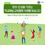 창의‧인성을 기르는 학교예술 교육활동 사례를 찾습니다 - 7월부터 지역별 공모전을 거쳐 10월에 전국 공모전 개최 - 교육부와 예술교육중앙지원단은 학교 예술교육을 통해 꿈과 끼를 발현할 기회를 제공하기 위한 ‘2017년 학교예술교육 공모전’을 10월 25일(수)부터 30일(월)까지 개최합니다. 올해로 2회째인 이번 공모전은 학교 예술교육 활동의 우수사례를 전국에 공유‧확산하고, 착한 경쟁을 통해 학생들의 잠재된 다양한 재능을 표출하는데 의의가 있는데요. 10월 전국 공모전은 시‧도 교육청별로 실시되는 지역 공모 결과 추천된 우수사례와 학생작품을 대상으로 합니다. 이번 공모는 예술교육 우수학교, 예술교육 우수수업, 학생예술 우수작품의 세 가지 분야로 나누어 실시됩니다. 【예술교육 우수학교】 학교예술교육 활..