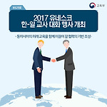 2017 유네스코 한-일 교사 대화 행사 개최 - 동아시아의 미래 교육을 함께 이끌어 갈 협력의 기반 조성- 교육부와 유네스코한국위원회는 「2017 유네스코 한-일 교사대화」행사를 7월 11일(화) 18시부터 서울 명동 세종호텔에서 개최했습니다. 「2017 유네스코 한-일 교사대화」는 한국과 일본 정부의 지원 아래 유네스코 국제이해교육을 바탕으로 양 국 교육발전 방안을 구상하고, 우호를 증진하기 위하여 2001년부터 시작되었는데요. 이 프로그램을 통해 교사들은 양 국 교육현장과 문화의 차이를 이해하는 시간을 갖고, 나아가 동아시아의 미래 세대가 소통하며 함께 발전할 수 있도록 하는 교육협력 방안을 모색합니다. 올해 행사는 일본 교직원 50여명을 초청하여 11일 저녁 공식 환영만찬을 시작으로, 6박 7일간..